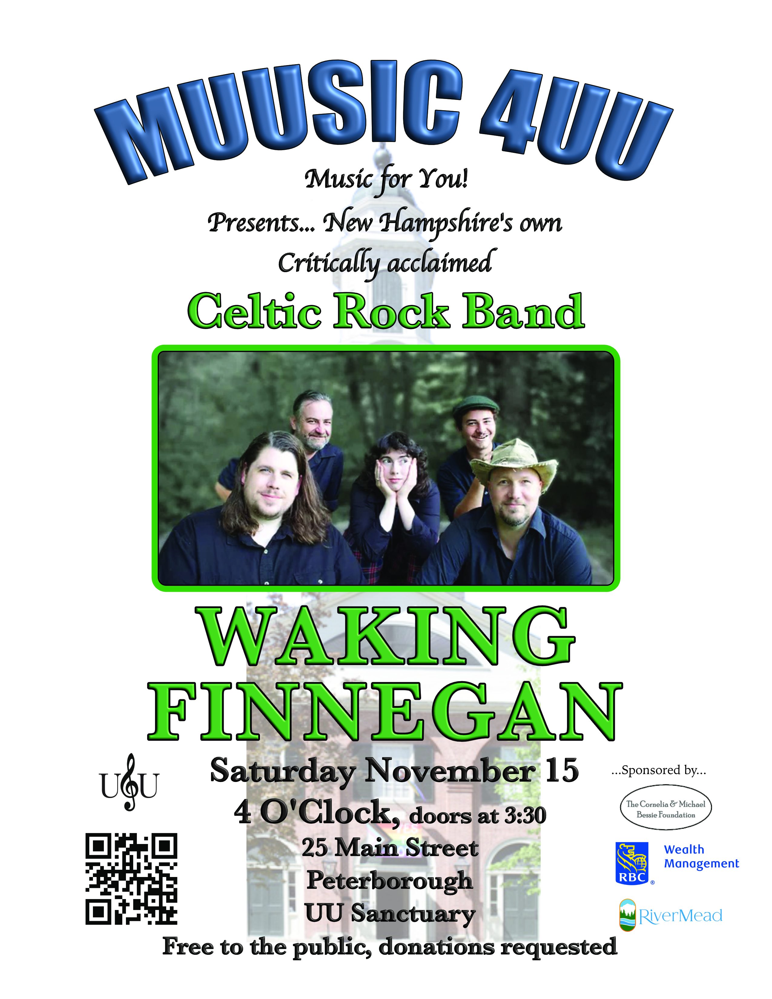 Waking Finnegan, New Hampshire’s own Celtic rock band, on Saturday, November 15 at 4:00 PM in The Sanctuary, 25 Main Street, Peterborough UU.
